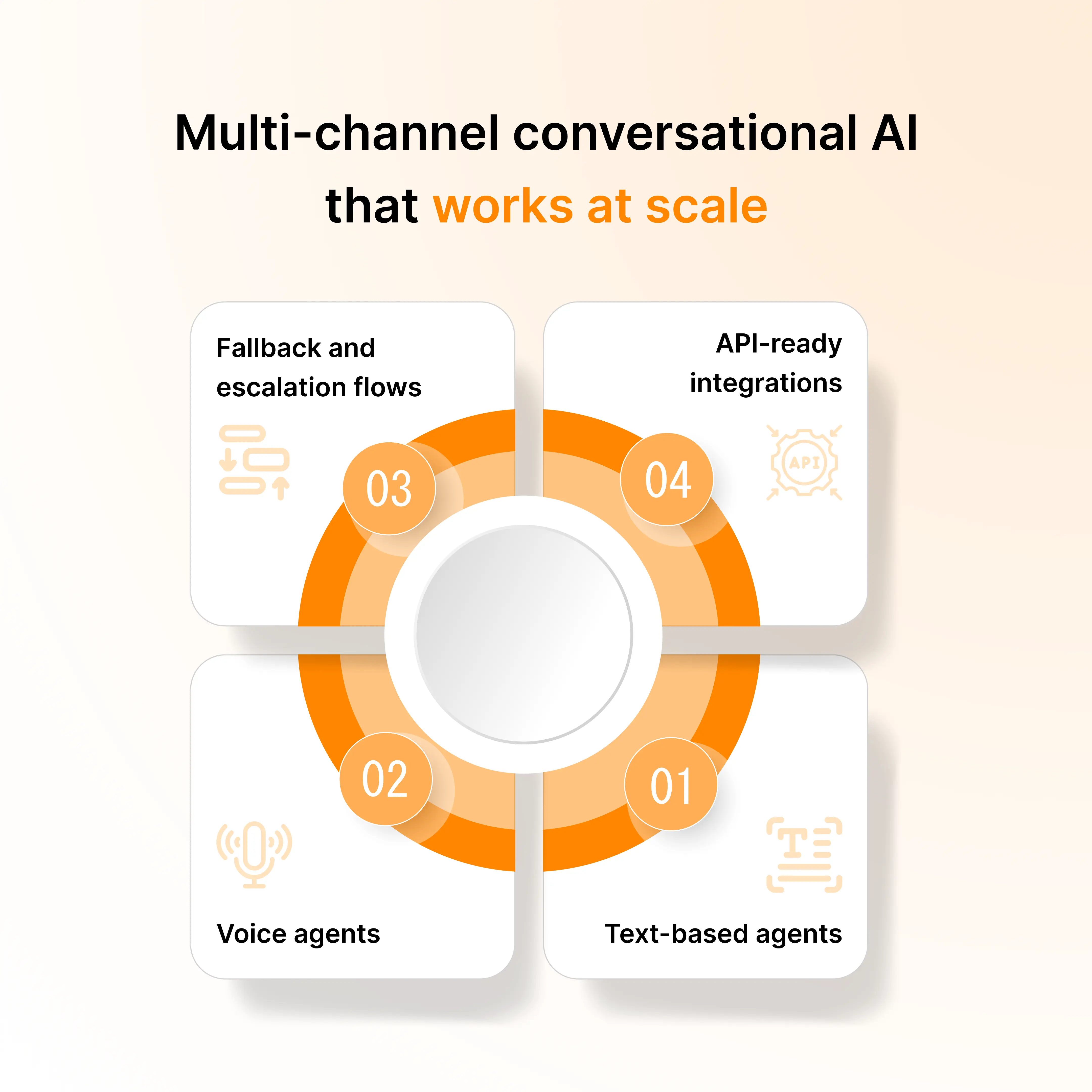 Deploy your own AI-powered conversational agent that handles queries across text and voice, with enterprise-grade fallback flows, seamless backend integrations and compliance built in from day one.