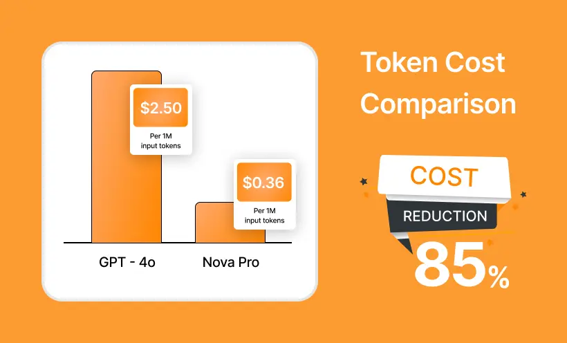 Nova Pro costs $0.36 per input token - 7x cheaper than GPT- 4o. Same capabilities, better performance, 85% cost reduction. Scale without price hesitation.